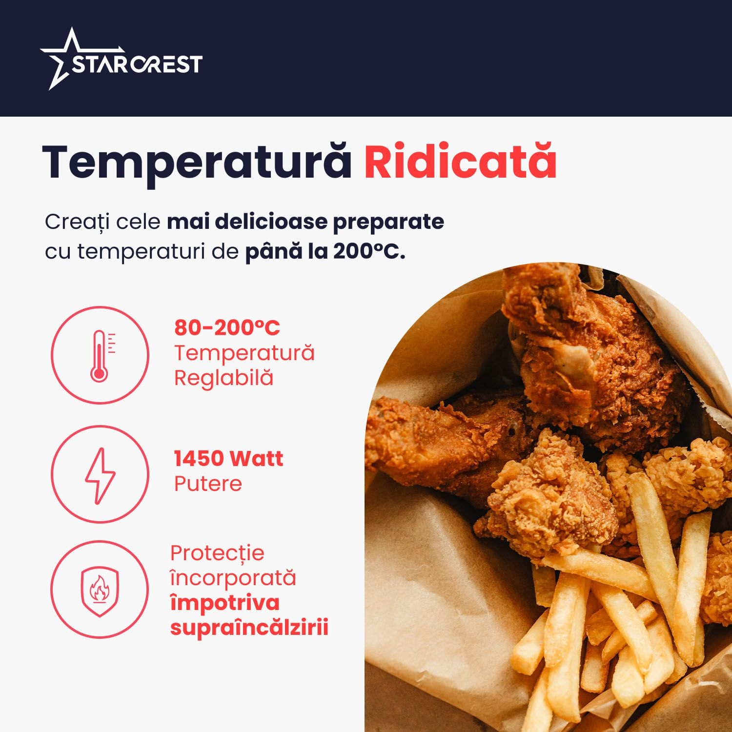 Combinatia unica intre circularea aerului cald si temperatura perfecta face ca in friteuza marca STARCREST, sa reusiti nu doar sa prajiti alimente, ci sa le si coaceti, sa le pregatiti ca pe gratar si sa le rotisati.