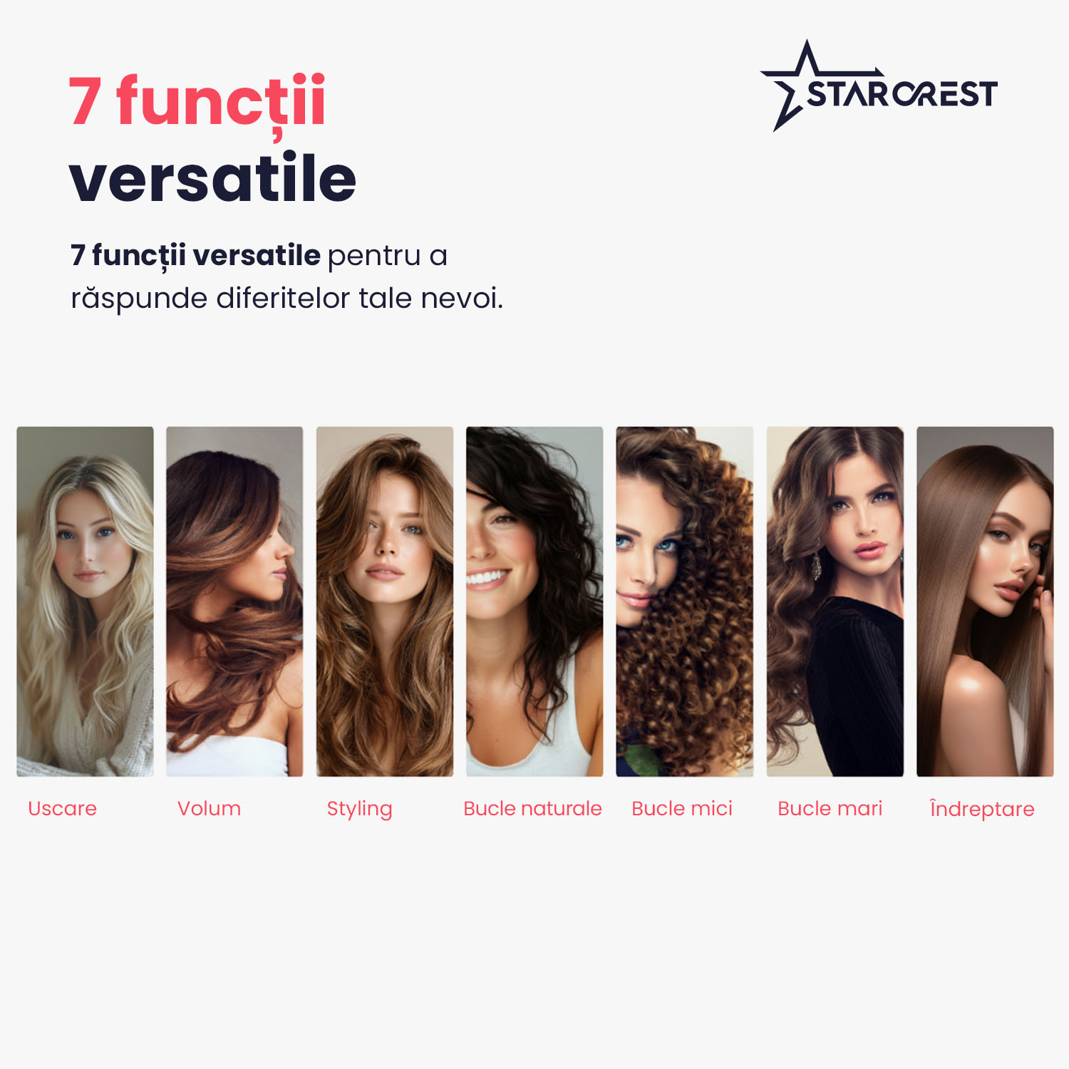 Uscătorul de păr este un aparat multifuncțional, ideal pentru a satisface diverse nevoi de coafare. Acesta oferă opțiuni pentru uscare rapidă, styling personalizat, crearea de bucle mici sau mari, volum, netezire, precum și îndreptarea părului.