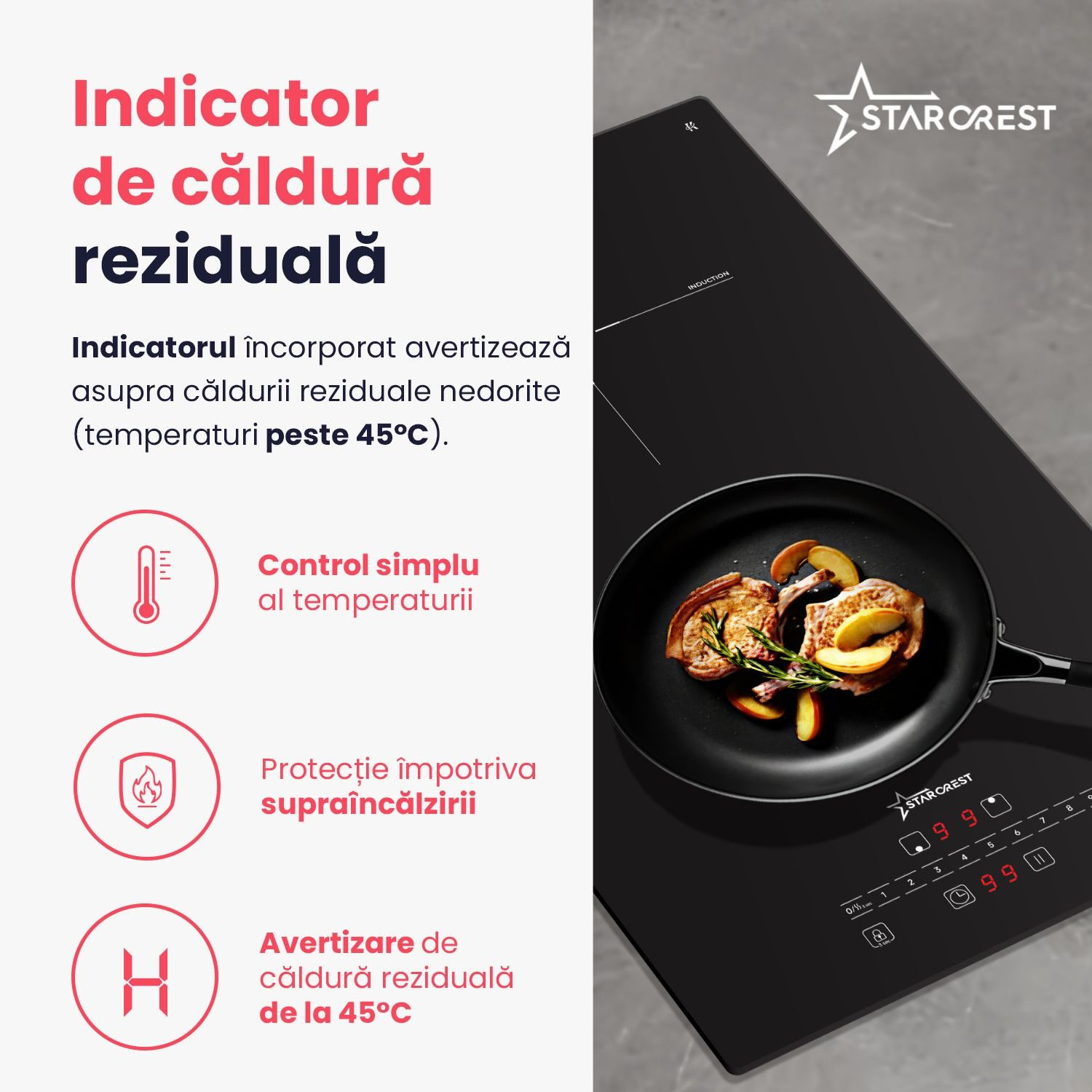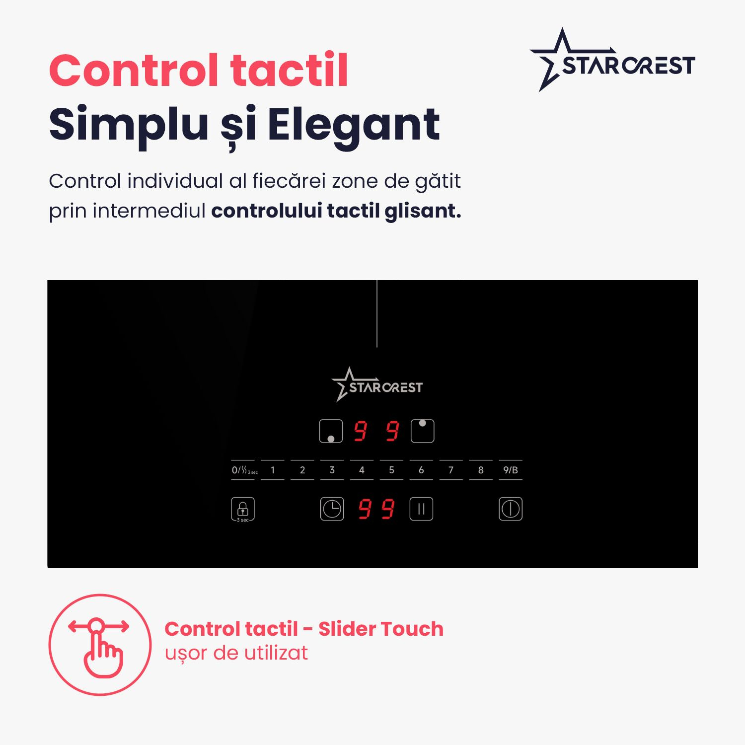 Plita STARCREST poate fi setată cu ușurință la temperatura dorită cu ajutorul butoanelor tactile, care îți oferă controlul deplin asupra tutoror funcțiilor plitei. Mai mult, îi conferă un aspect elegant și rafinat.