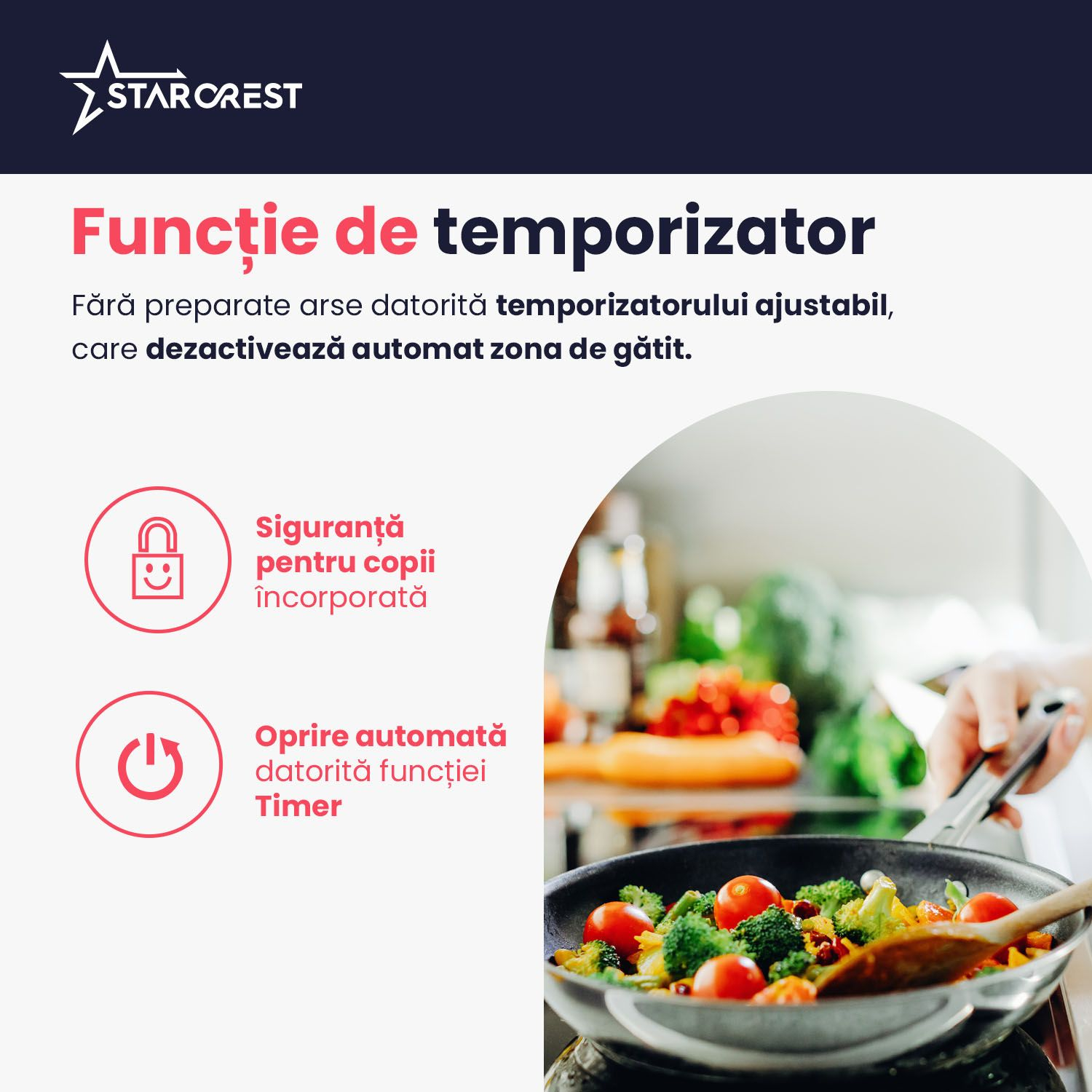 Cu ajutorul timer-ului, puteți selecta întotdeauna timpul perfect pentru fiecare preparat. Totul se gătește rapid si eficient, iar la finalul timpului setat, plita dezactiveaza automat zona de gătire astfel încât preparatele dumneavoastra nu se vor arde.