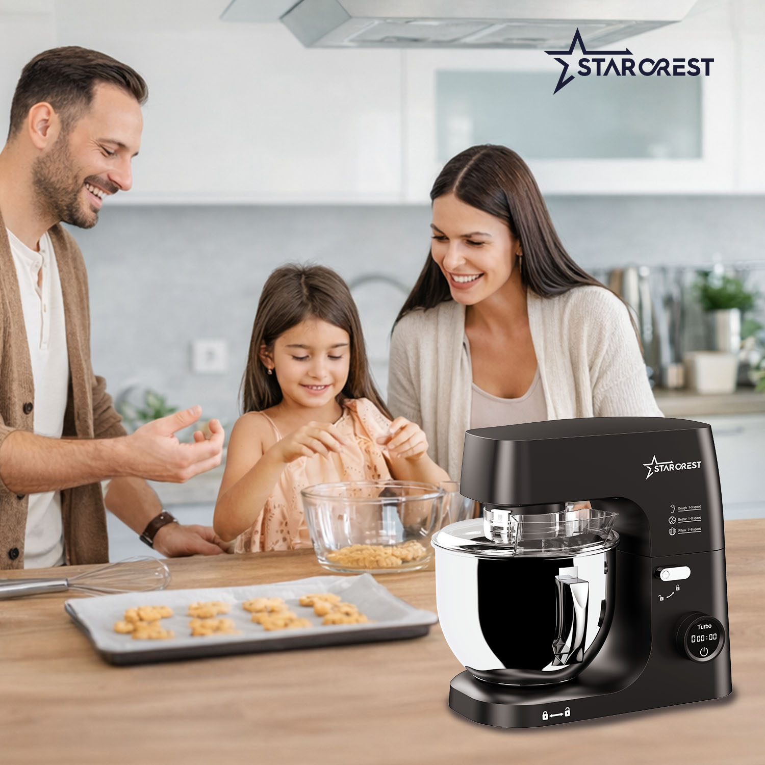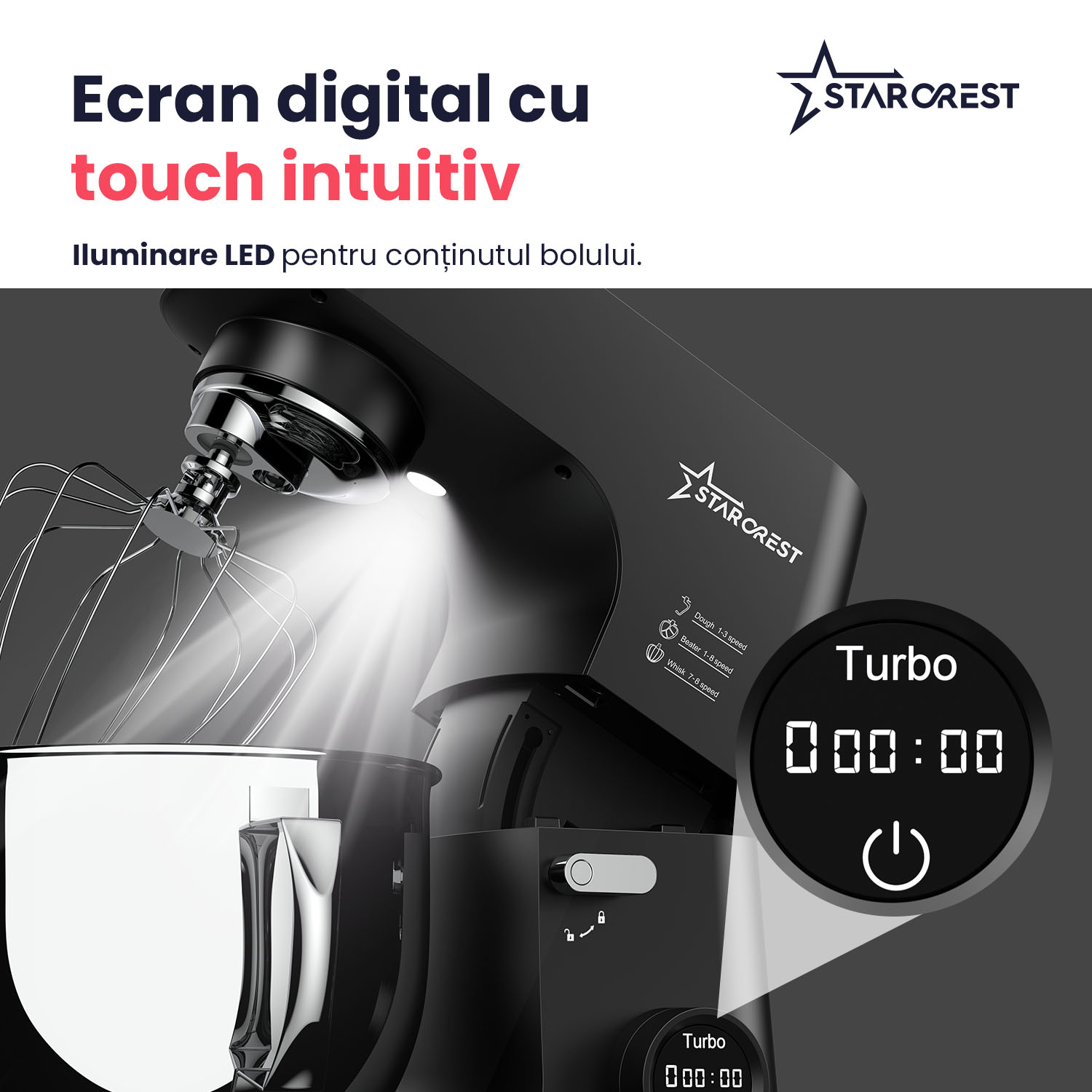 Mixer cu bol de 7L din inox, STARCREST SKM-2070BK, 2.1 kg aluat, putere 2000W, 3 accesorii din inox, 8 viteze + Turbo, Negru