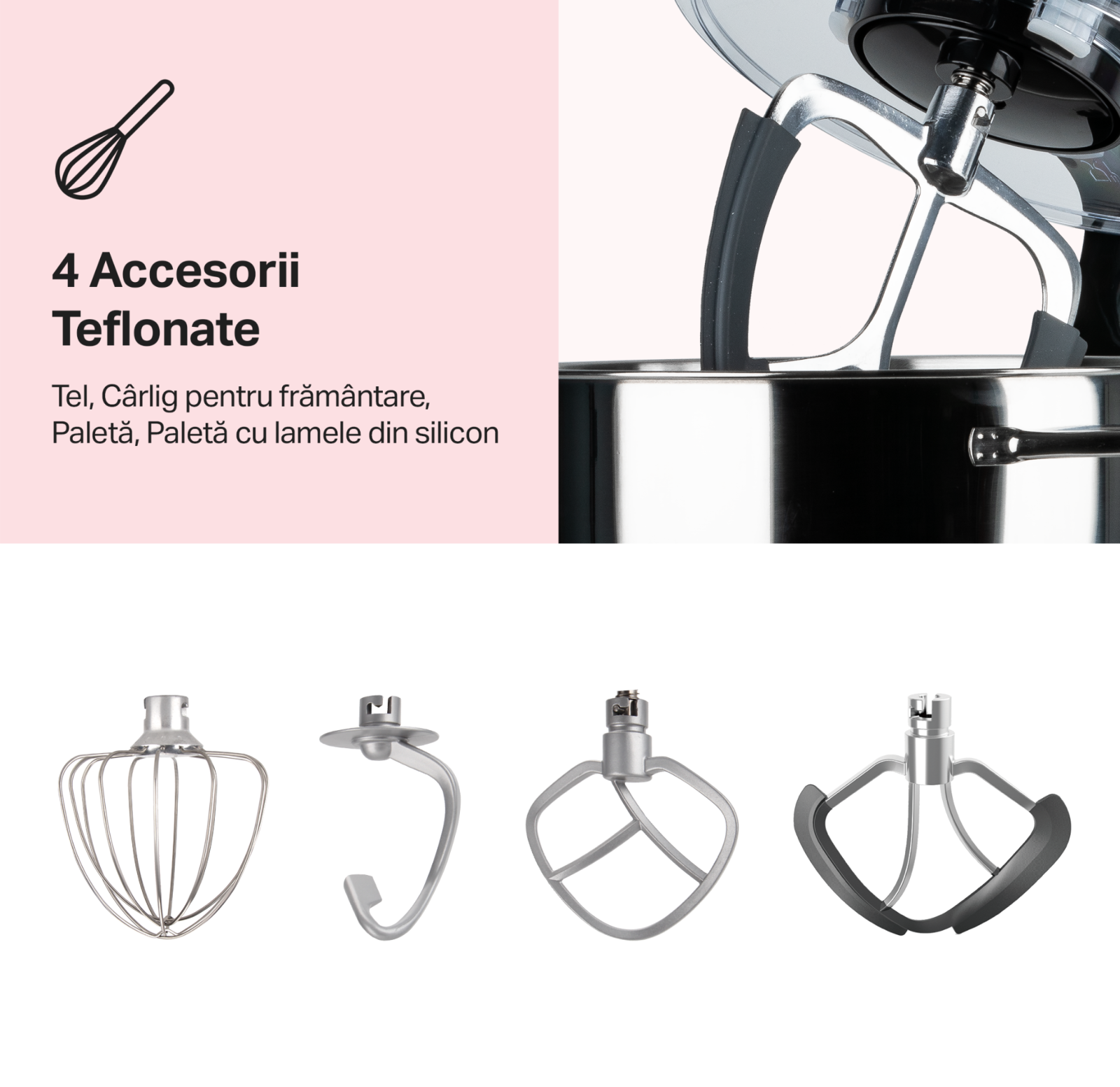 Accesorii incluse: tel din inox, cârlig pentru frământare, paletă pentru amestecat, paletă teflonată, paletă cu garnitura de silicon, bol, capac pentru bol