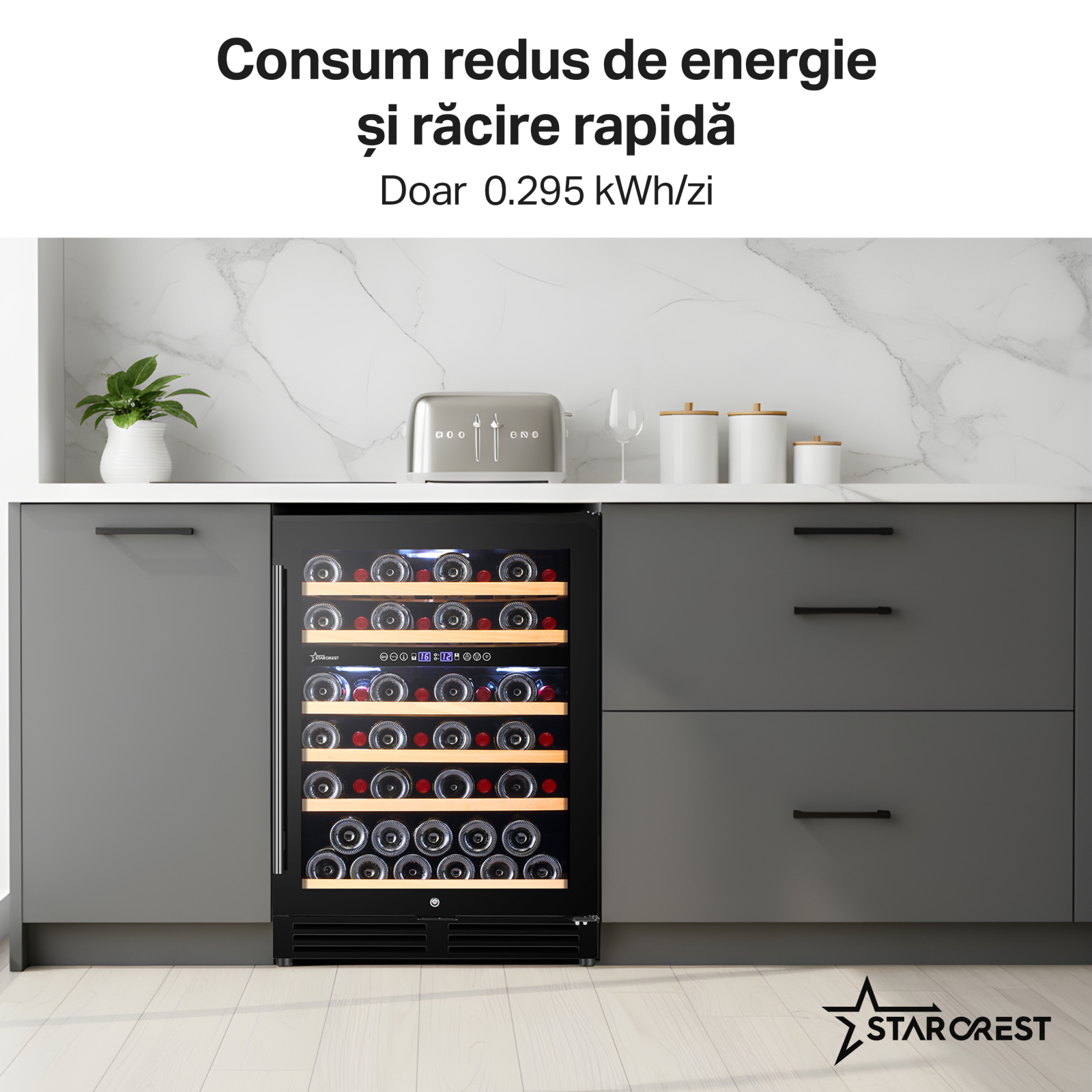 Vitrina de vinuri incorporabila STARCREST SWN-13851DZ , Capacitate 51 sticle, Clasa F, Rafturi din lemn de fag, Control electronic, Display, 2 zone de racire, Iluminat interior LED, H 82 cm, Negru